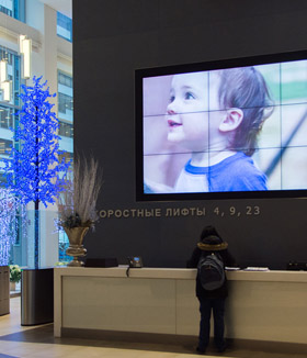 Или пример из корпоративной жизни. Компания регулярно проводит встречи с дилерами, с вендорами, презентации продуктов и для этих целей в зоне регистрации, в холле и в конференц зале устанавливает видеостену, светодиодный экран, несколько информационных панелей и интерактивных дисплеев объединенных системой digital signage. Широкоформатные экраны могут использоваться для приветствий, демонстрации программы мероприятий, актуальных объявлений, презентационных, учебных и рекламных материалов. Подобные инсталляции также незаменимы в выставочном зале, гостинице, ресторане, где регулярно проходят корпоративные мероприятия.