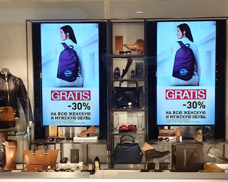 Сначала следует определиться с размерами. Если видео витрина обращена на улицу, то существуют некоторые ограничения по заполнению оконных проемов магазина рекламными конструкциями. Кто-то учитывает муниципальные правила, кто-то нет. И те и другие используют то, что инсталлировали и поэтому, утверждать однозначно, что контролеры строго следят за соблюдением норм или не следят совсем - сложно.