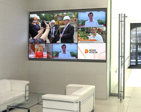 Сеть широкоформатных дисплеев digital signage корпоративного пространства может состоять из десятков или даже сотен экранов, которыми можно управлять одновременно или группой. Прежде всего, так сказать традиционно, из них выделяют входную зону, где уместно разместить приветствие и короткие фильмы презентационного характера.